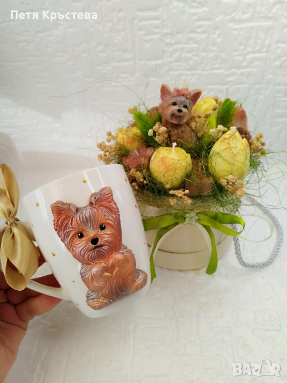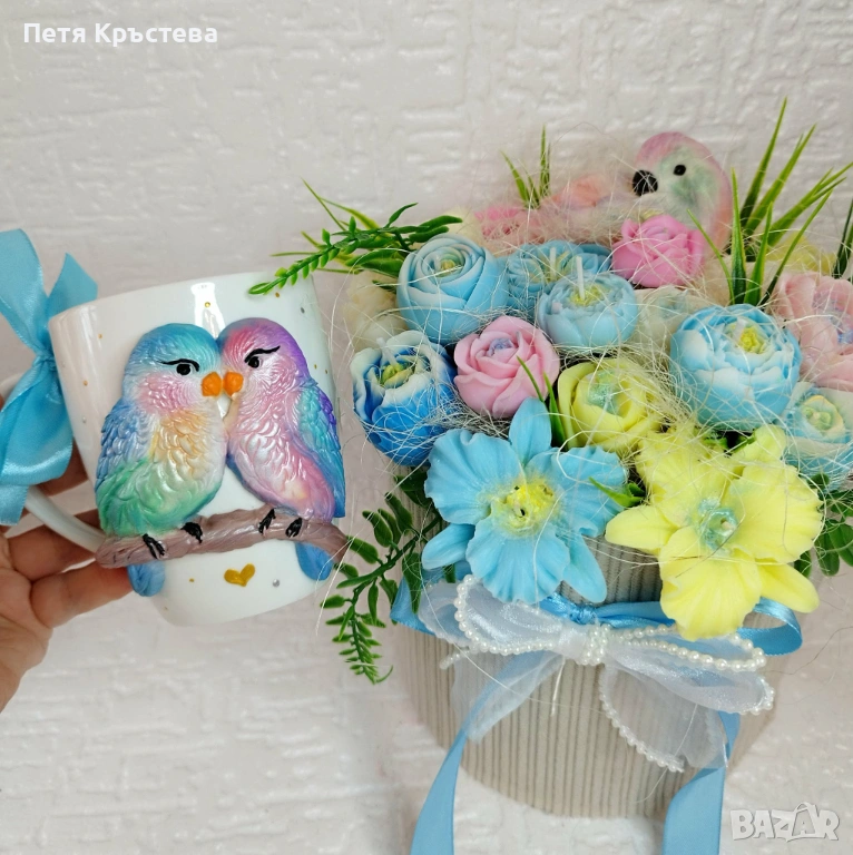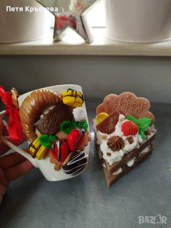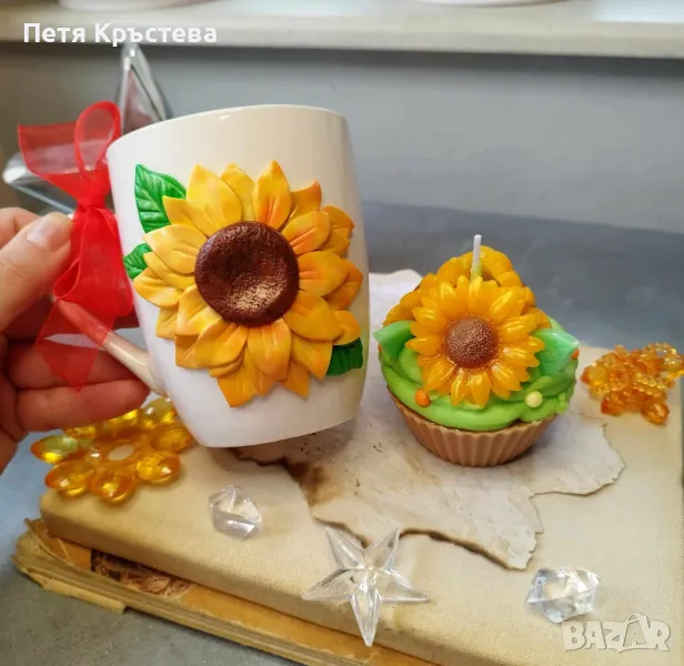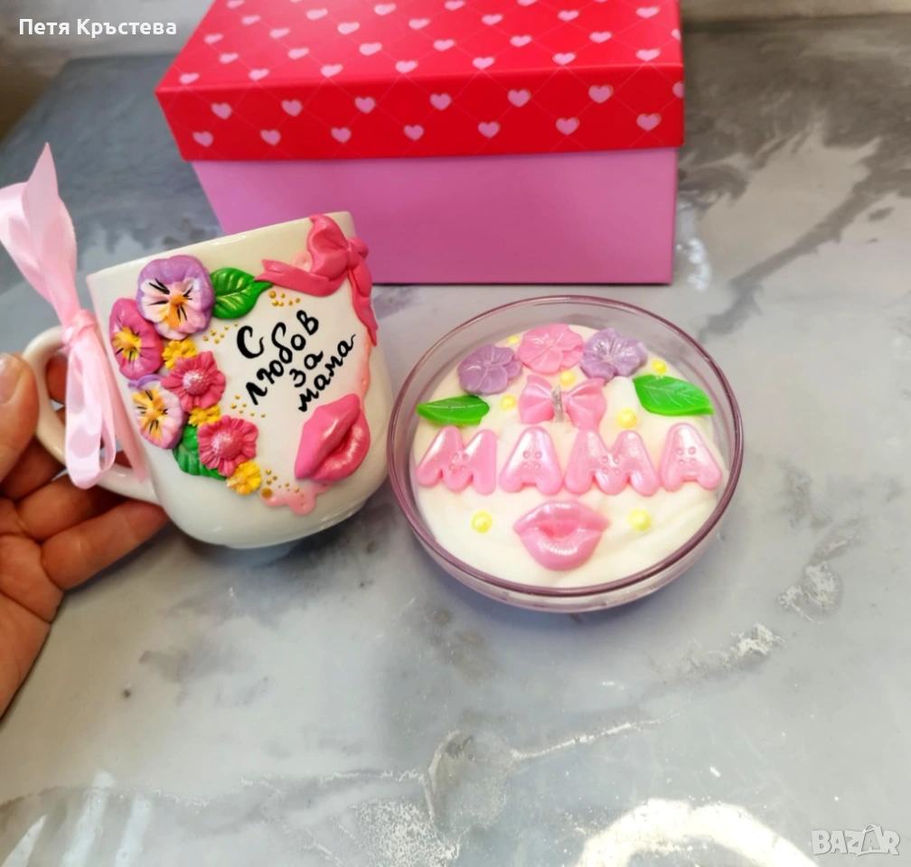 Чашите и свещите са изработени с полимерна глина. Прекрасен начин да зарадвате себе си или да направите един уникален и запомнящ се подарък, с който ще покажете Вашето специално отношение.Както и самата форма на чашата може да е различна от тази на снимката, според това какво имаме наличност.