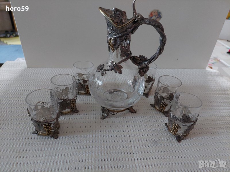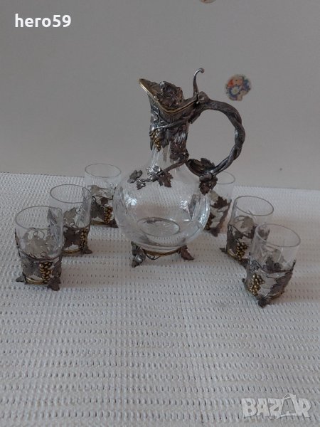 Предлагам за продажба този комплект Кана за ракия плюс шест чаши.Материалът е кристал и сребро,видно и от снимките.