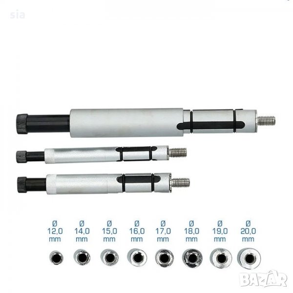 Комплект от 8бр. стоманени втулки и 3бр. разширяващи се водача. Бързо легулиране на диаметъра на главата чрез винт. Универсален.