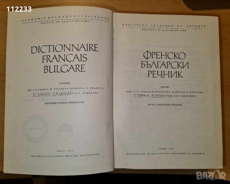 Френско български речник. Т. Томов, М. Филипова-Байрова, А. Спасова, Г. Дорчев, П. Камбуров, Й. Симеонов. 1972 година 1220 страници,голям формат,твърди корици.