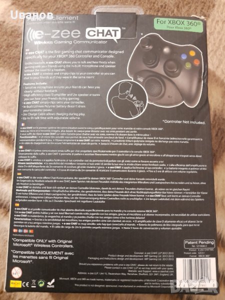e-zee CHAT е комуникатор за чат за игри, създаден специално за XBOX 360 контролер и конзола. За разлика от слушалките, e-zee CHAT ви позволява да говорите и чувате свободно, когато играете с приятелите си, като използвате вградения микрофон и високоговорител, без да имате нужда от слушалки. e-zee CHAT е безжичен и просто се прикрепя към вашия контролер, за да можете да чатите с приятелите си, сякаш са в една и съща стая!