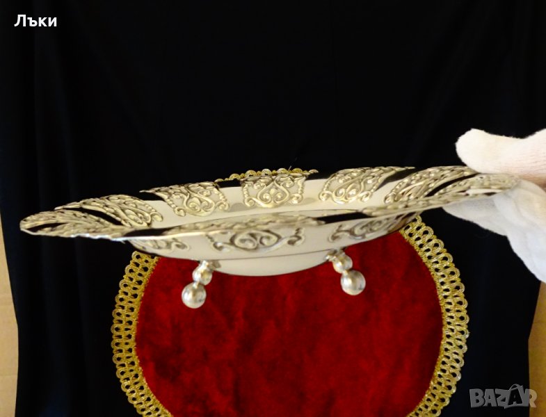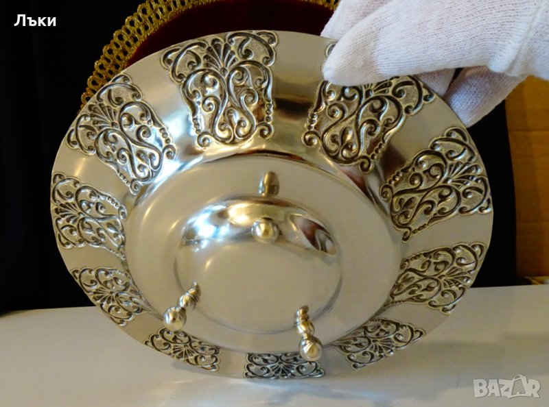 орнаменти.Има три стабилни крачета.Височина 4.5 см.,диаметър 22 см.,тегло 220