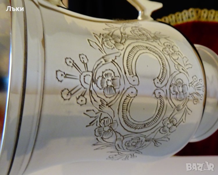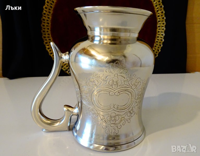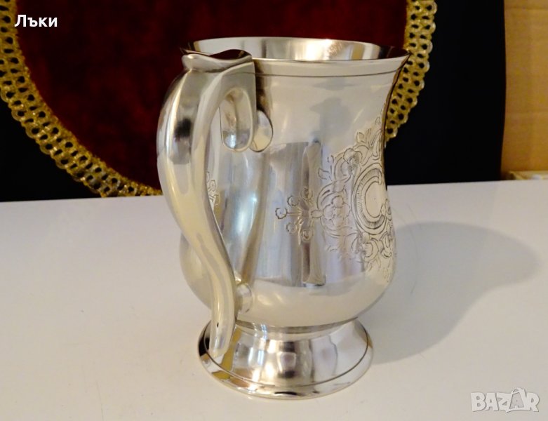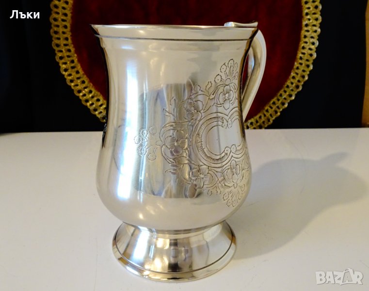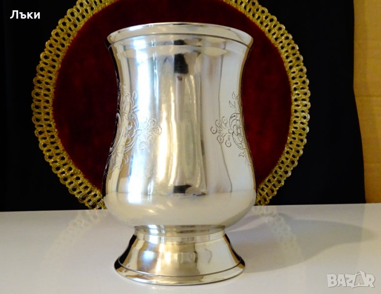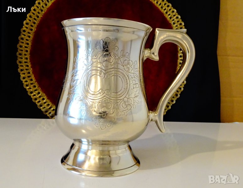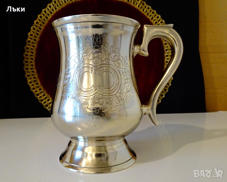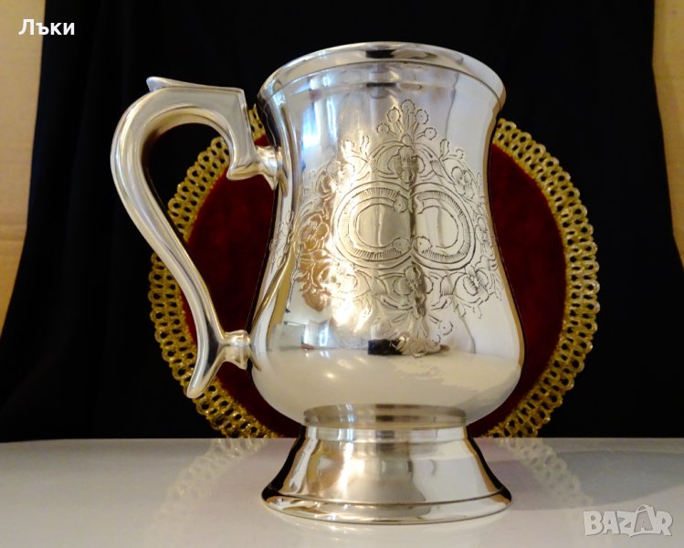 изработка от масивно отлят високо качествен бронз.Маркиран E.P.N.S.A1.От вън е посребрен,декориран от две страни с разкошни релефно гравирани барокови орнаменти и цветя.Ефектен дизайн,кристална гладкост,блясък и камбанен звън.Вечна халба.Височина 13 см.,диаметър 9 см.,тегло на всеки 380 гр.Вместимост 400 мл.