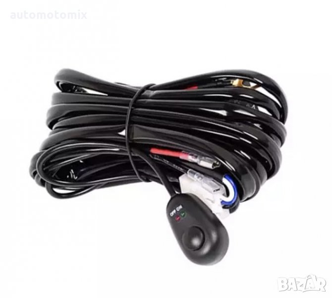 Комплект окабеляване на Лед барове,фарове,халогени и други с кабелни обувки,предпазител,реле и ключ - прекъсвач с LED индикация за включени и изключени светлини.