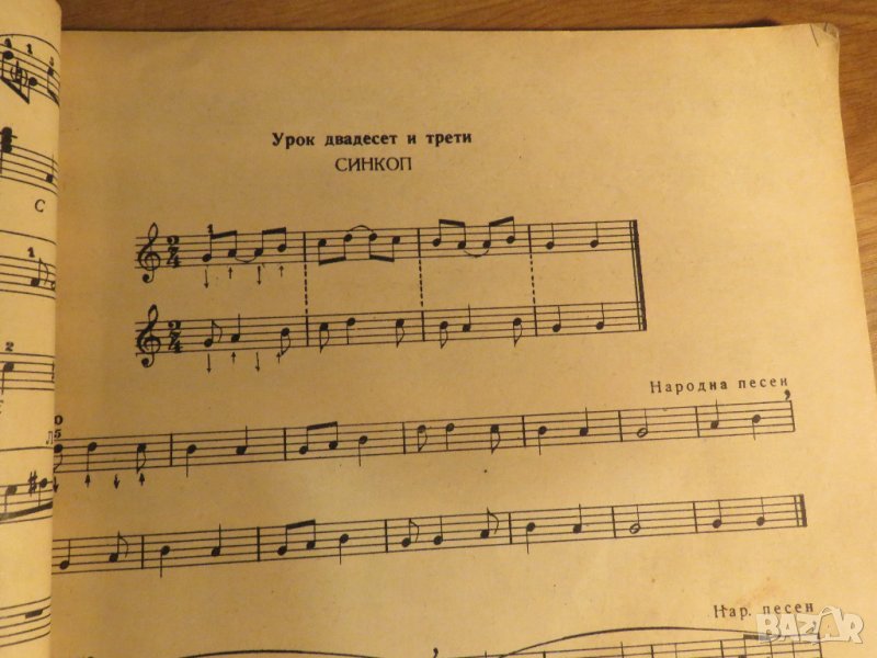 Школата е в картонена зелена корица и е добре запазена за годините си и е голям формат с много обяснения и ноти и акорди за вас .