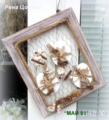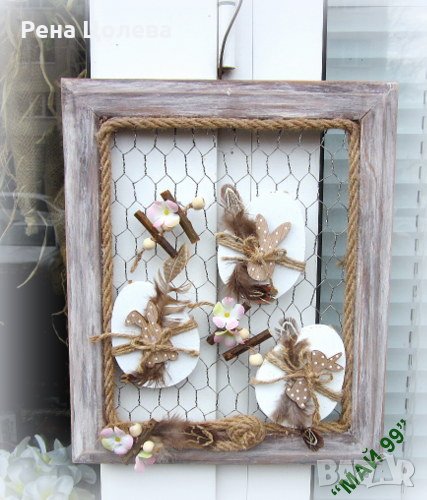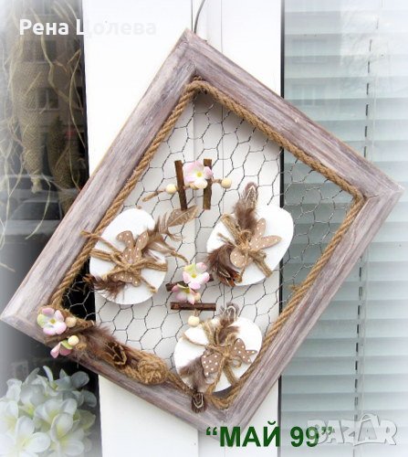 Ръчно изработена,великденска висяща украса на дървена рамка 30/25 см.състарена и с метална мрежа с дървени бели,плоски яйца с малки дървени зайчета на точки,дървени елементи,пера,въже и малки нежни,бледорозови цветчета!
