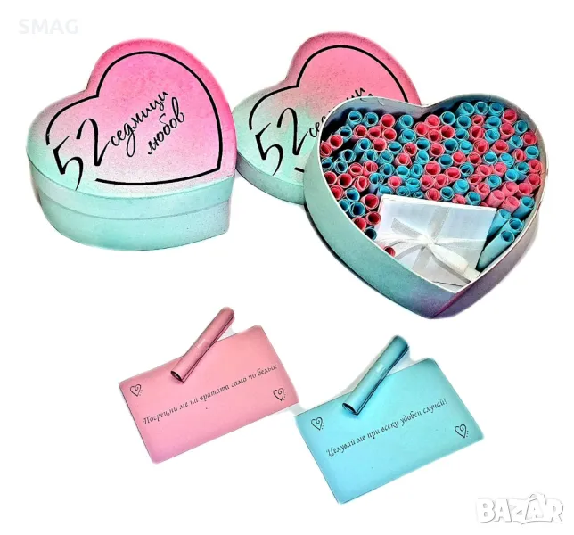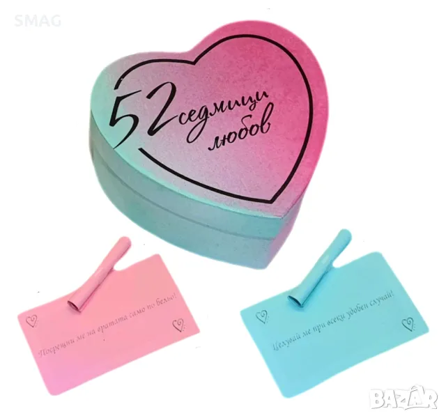 Комплектът „52 седмици Любов“ е идеалният подарък за вашата половинка по повод празника на влюбените, рожден ден, имен ден или просто ден, в който искате да покажете любовта си. Той съчетава романтика, страст и интимност в красива кутия във формата на сърце, под капака на която се крият различни любовни желания, написани на малки листчета. Този уникален подарък във вид на игра ще заздрави връзката ви и ще ви направи по-близки, докато се забавлявате с всички написани предизвикателства.