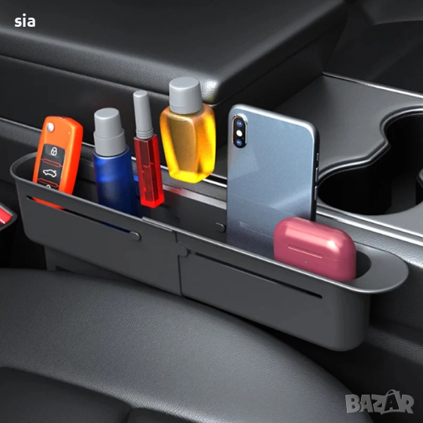 Компактен и функционален органайзер, проектиран за поставяне между автомобилната седалка и централната конзола. Идеален за съхранение на телефони, ключове, карти, дребни аксесоари и други вещи, които лесно могат да паднат в трудно достъпни места. Изработен от устойчив материал, с елегантен дизайн, който се вписва в интериора на повечето автомобили. Лесен за поставяне и изваждане – без нужда от инструменти. предната седалка и решава проблемите с разхвърляните