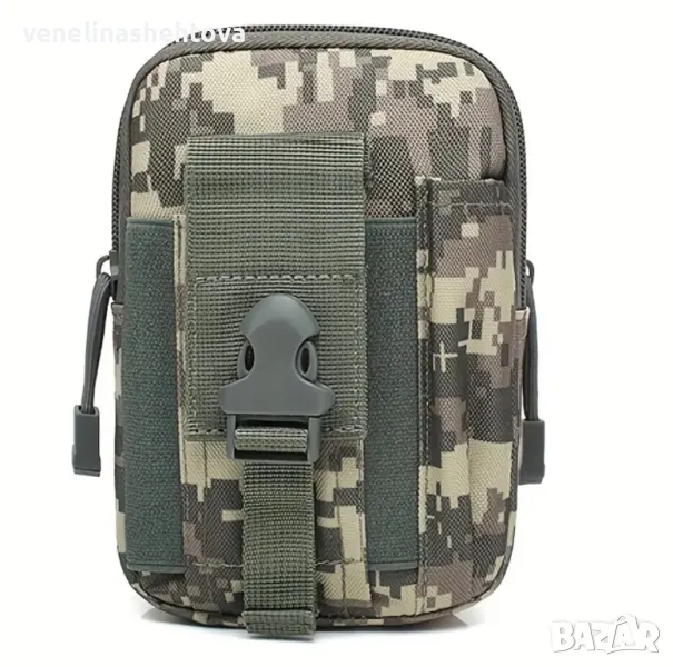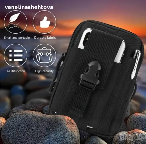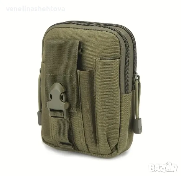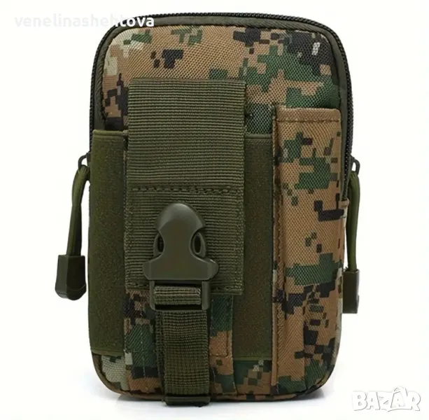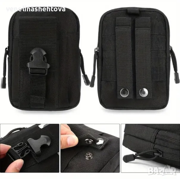 Две големи отделенив с цип, няколко малки вътрешни прегради, подходящи за портфейл, външна батерия, фенерче, цигари, инструменти и аксесоари.