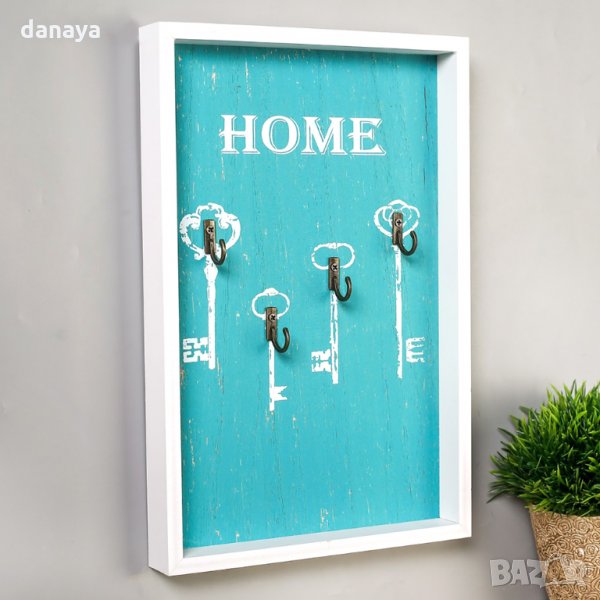 Семпла и стилна къщичка за ключове с надпис Home в тюркоазен цвят на лицевата си страна. Кутия за ключове с 4 кукички за закачане на ключове или дребни аксесоари. Оригинално допълнение към интериора у дома. Кутията е изработена от МДФ материал.