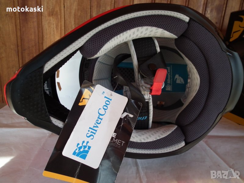 Thor Verge GP Pro мотокрос шлем каска за мотор, покрива AMA и FIM стандартите за използване в състезание, много добра вентилация, нов, но е възможно да е бил магазинна мостра, размер (по моя преценка) XL или 61-62 см., перяща се, антибактериална и абсорбираща влагата Silvercool вътрешност, с калъф, упътване, допълнителен болт и лепенка за състезание с лични данни (кръвна група и т.н.), цена: 269 лв.