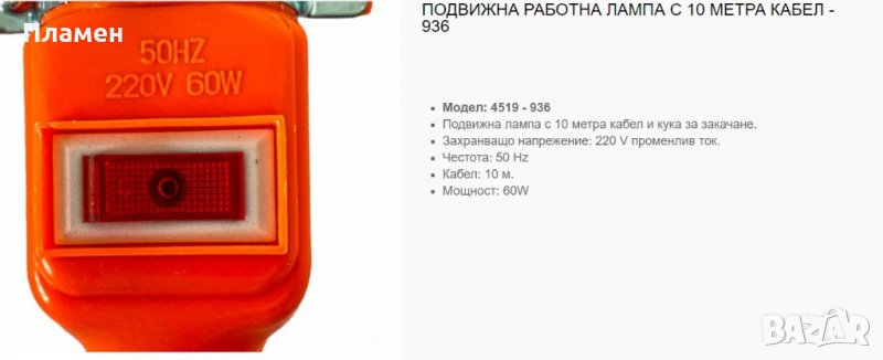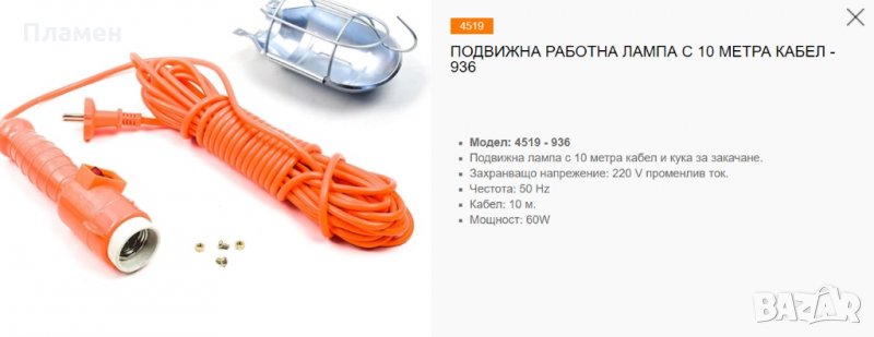 лампа с кабел 10 м. Е 27 крушка 60 Wс кука за закачане.