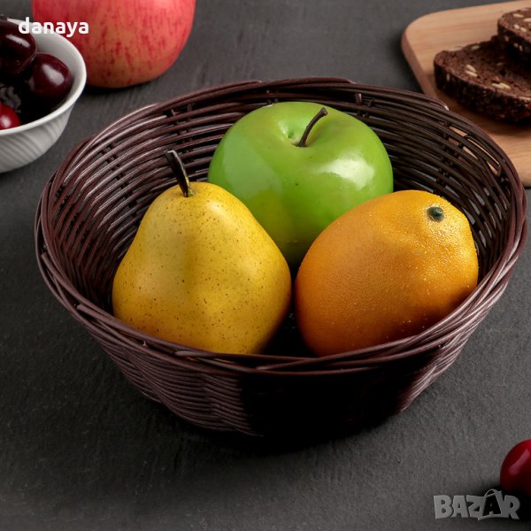 Кръгъл панер за хляб, плодове, великденски яйца, дребни лакомства, бонбони и т.н. Прекрасен акцент на трапезата. Панерът е в тъмно кафяв цвят, което му придава винтидж стил и може да се използва и като декорация в битов кът.