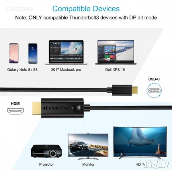 Работи с компютри с USB-C порт с DP Alt режим. Кабелът USB С към HDMI ви позволява директно да свържете USB-C компютър към дисплей, оборудван с HDMI. (*Забележка: Проектиран само за компютър, не за мобилни телефони (с изключение на Samsung Galaxy S8 или S8 Plus) и таблети.)