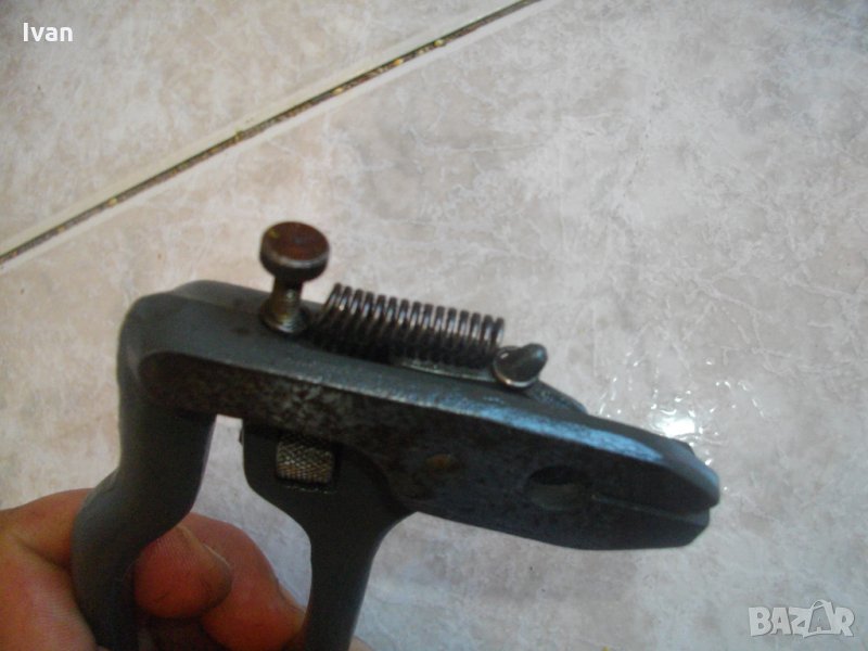 Пружинен възвратен механизъм отгоре.Наковалнята на главата е закалена стомана, а механизма над нея - двустранно заточен с широко острие.Регулиращата винтова ос за чапраза също е стоманена.