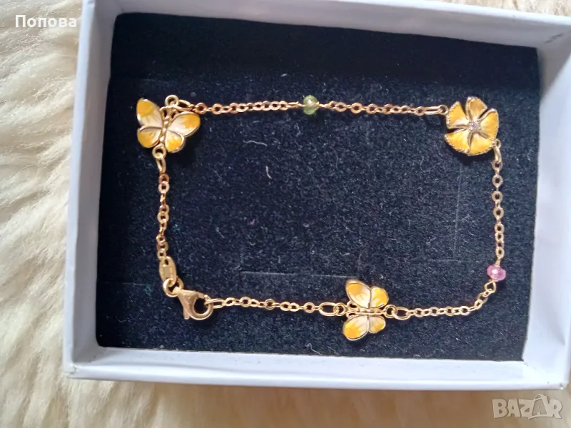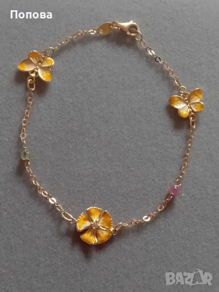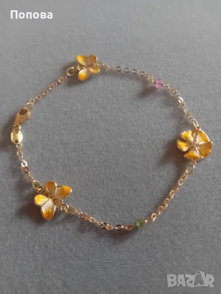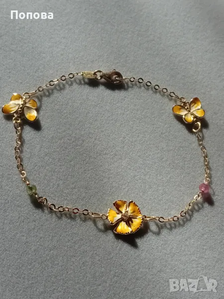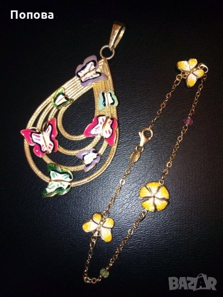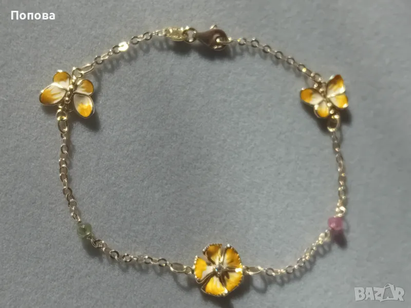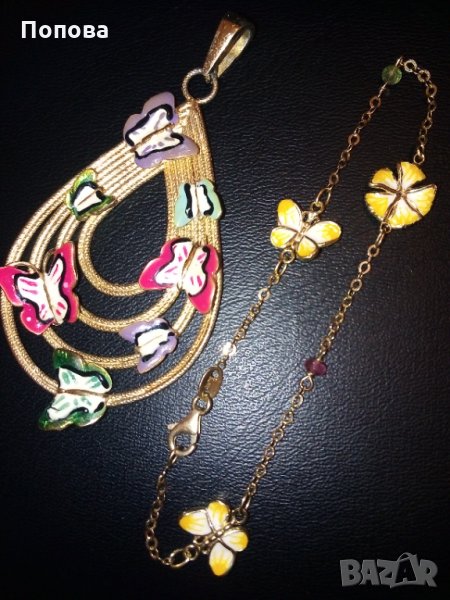 Уникални!Маркова италианска златна гривна 18к. и сребърен медальон с пеперуди ипозлата