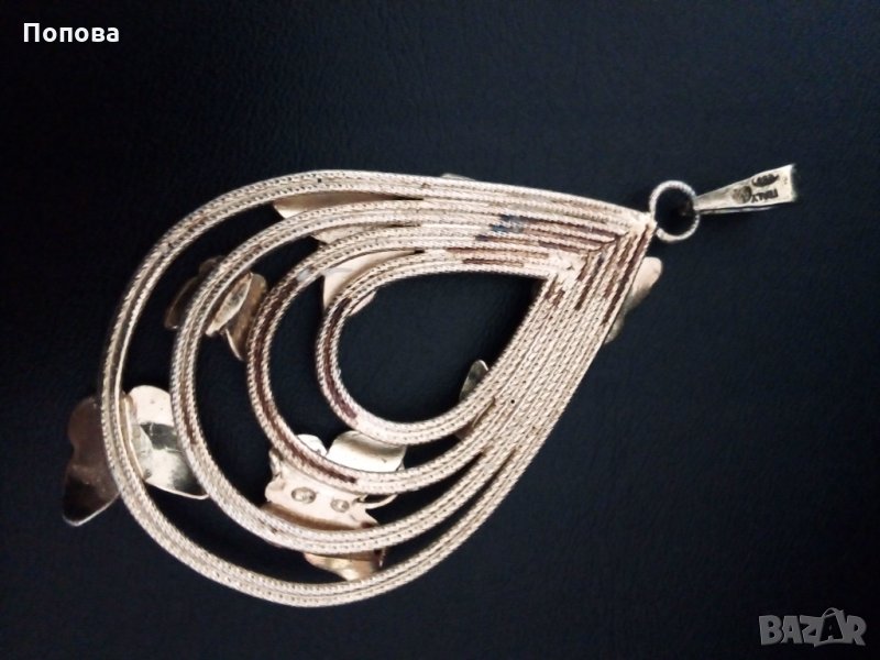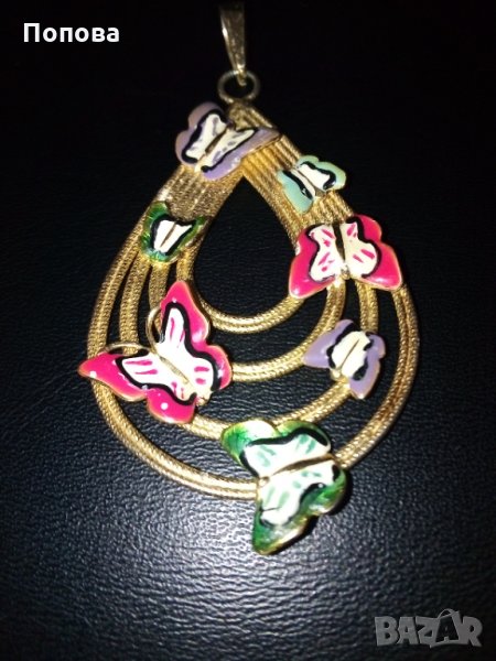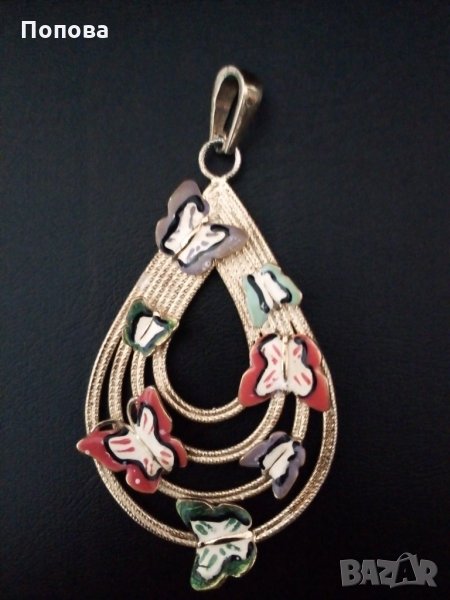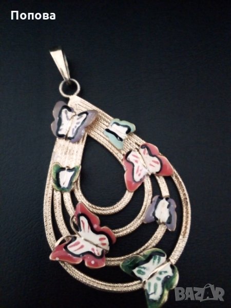 Масивен сребърен медальон проба 925,ръчна изработка с разноцветни пеперуди с емайл и позлата. Изглежда като златен. Огромен, с халката е 7,2 см. на 4 см.