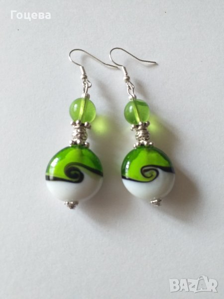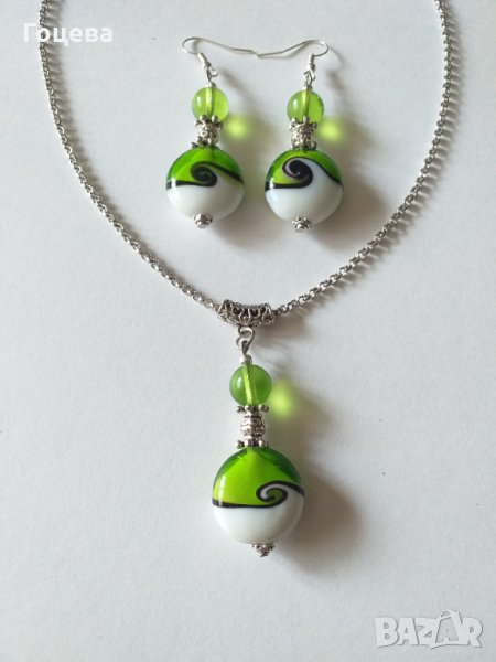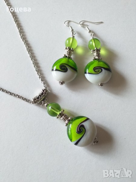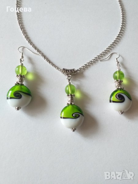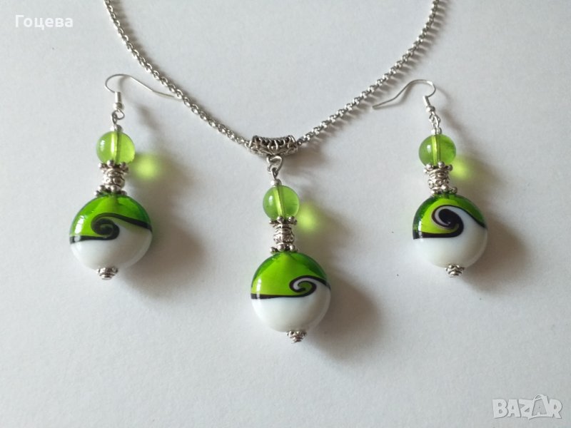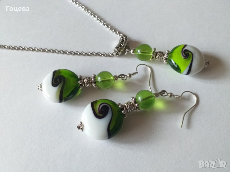 Красив комплект бижута с ръчно изработени стъклени Мурано мъниста в лазурно зелено и бяло → Обява 35684007