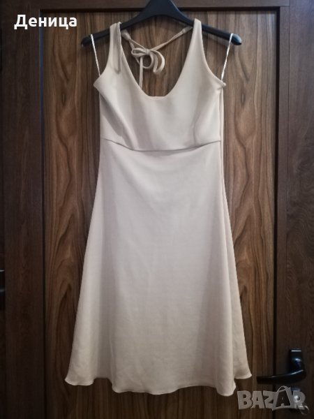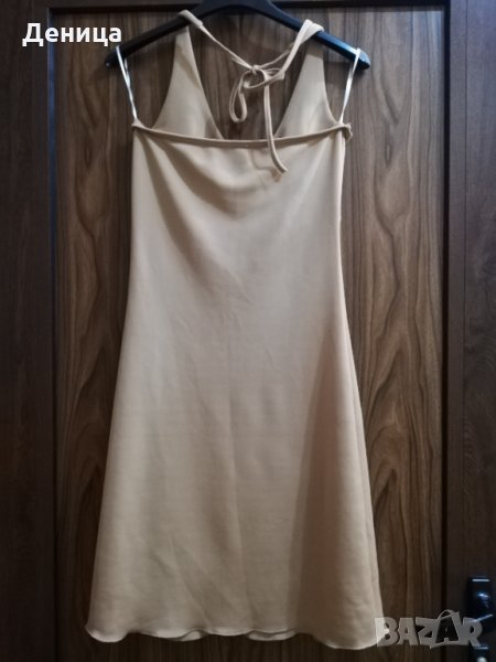 Роклята е С-М размер, с гол гръб. Бежово-нюд цвят. На врата се връзва. Има много лека забележка, снимала съм я, малко избелено. Роклята е полска. Материята е много лека и роклята стои по тялото, надолу е леко разкроена.
