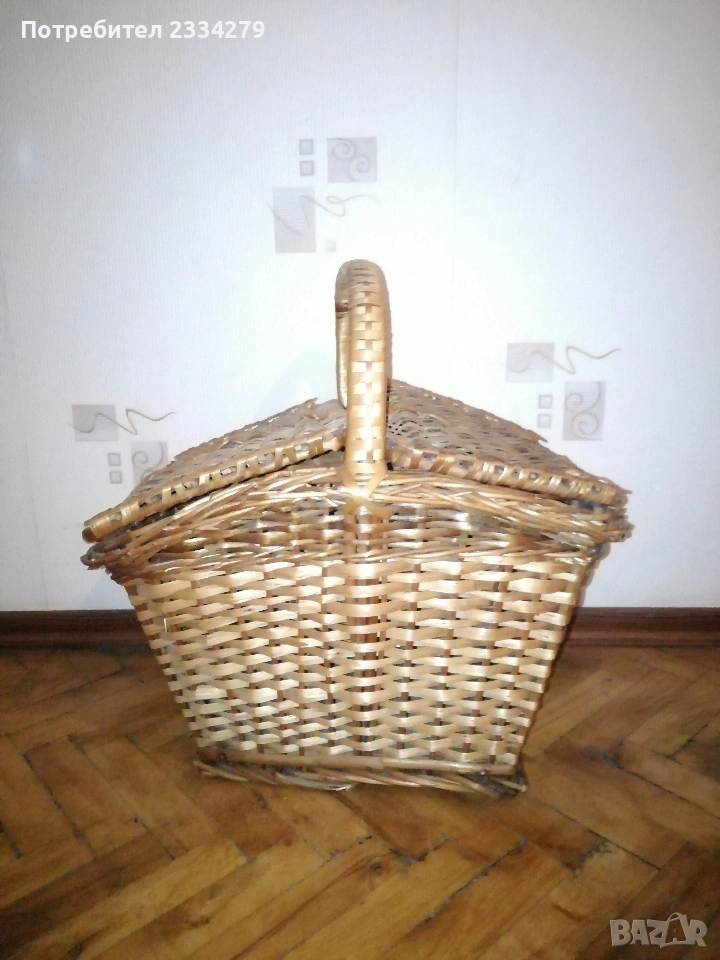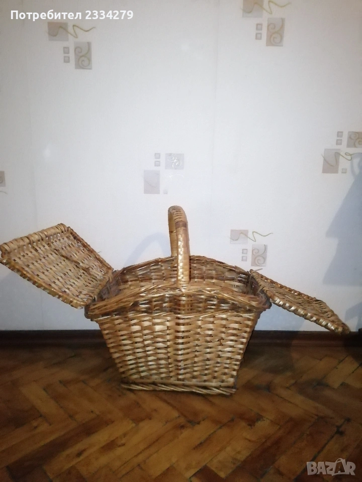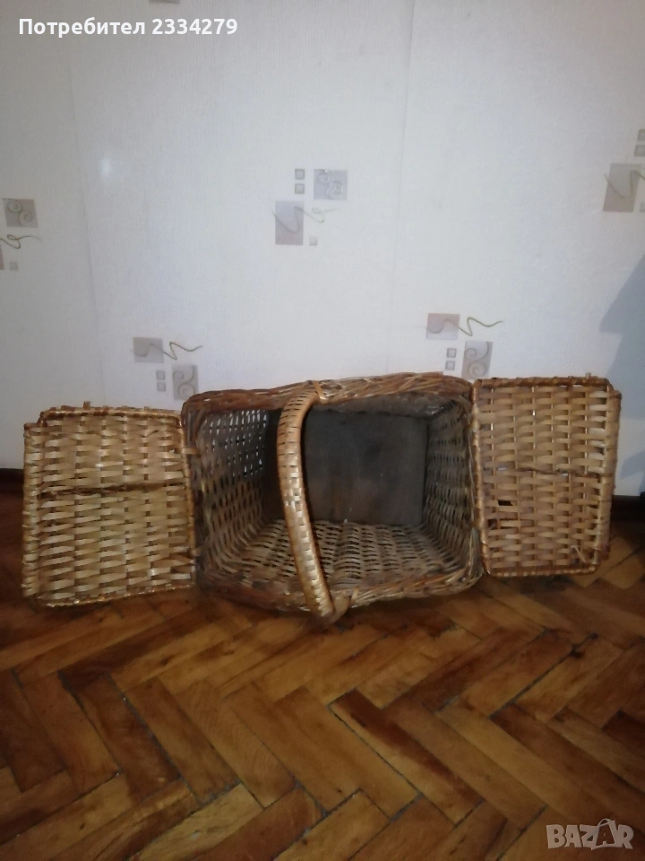 размери: дължина 50см. широчина 37см. височина без дръжка 37см.(липсва единият капак). Дамаджана та е здрава и с вместимост 10литра; N:2 стара ръчно изплена кошница за пикник, плодове и други с два отварящи капака, цена 18€. Оригинална 100% автентична декорация за битова къща, двор, механа, градина.