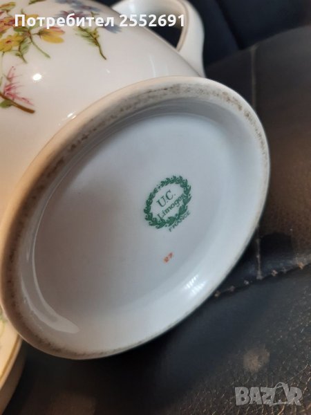 Порцеланова френска кана с капак "U.C. Limoges". Височина- 21см. Ширина с дръжката-22см. Диаметър в основата- 8,5см. Наличие на маркировка и номер. Златна декорация. Има забележка.