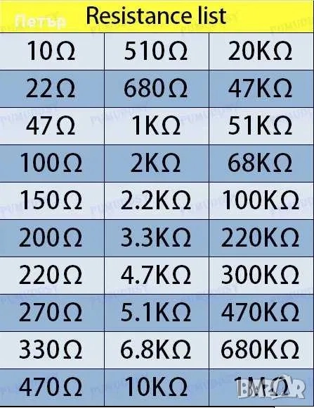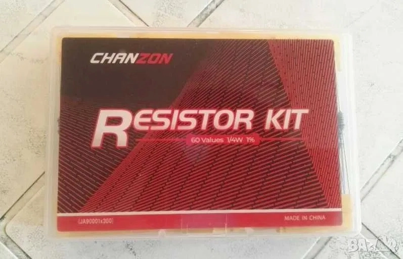 1. Комплект резистори в кутийка. На нея има наличен цветен код за разчитане на съпротивлението на резисторите.