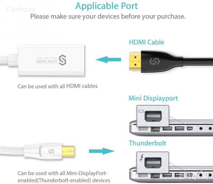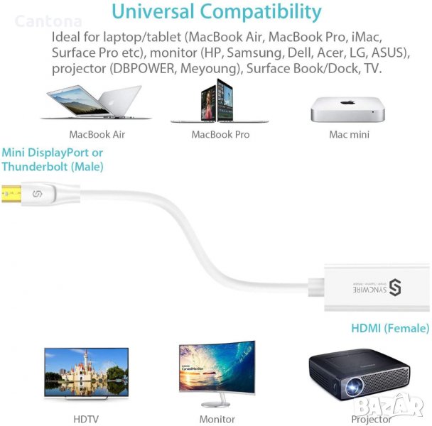 Syncwire 4K Mini DisplayPort към HDMI 2.0 адаптер е идеален за лаптоп / таблет (MacBook Air, MacBook Pro, iMac, Surface Pro и др.), монитор (HP, Samsung, Dell, Acer, LG, ASUS), проектор (DBPOWER , Meyoung), Surface Book / Dock, TV [ Забележка: Mini DisplayPort = конекторът Thunderbolt 1 и 2, не е подходящ за Thunderbolt 3 = USB-C порт]