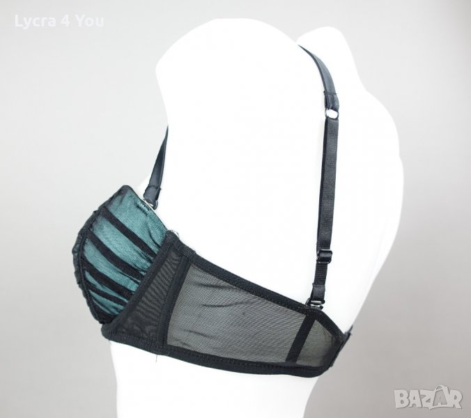 Прекрасен сутиен в черно с чашки в тюркоазен цвят покрити с тюл и сатенени вертикални ленти. Презрамките са регулеруеми и на гърба е с двустепенно закопчаване. Размер: 75 В