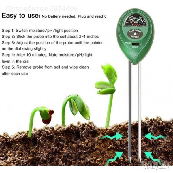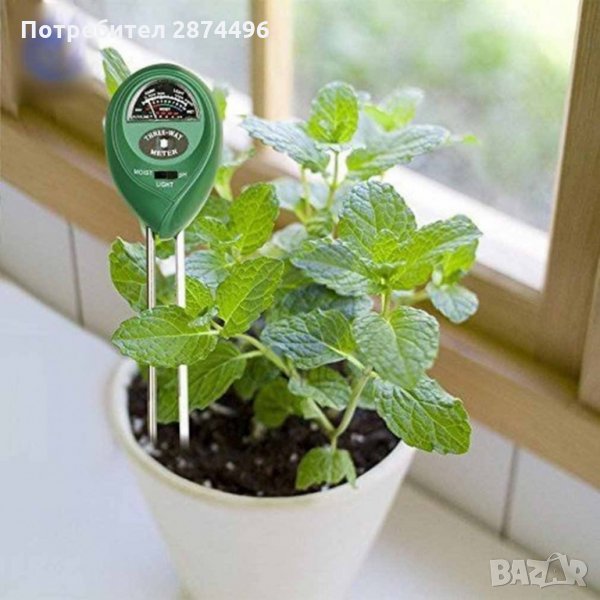 Този 3-в-1 измервател на влага, pH и светлина в почвата е проектиран, както за вътрешна така и за външна употреба, за да се следи по-доброто състоянието на вашето растение. Той ви помага да контролирате стойността на pH в почвата, влажността (кога трябва да поливате растението или да не го правите), а също така да знаете дали то получава достатъчно слънчева светлина. Идеален инструмент за любители на растенията, за да ги поддържате по-здрави. Отчитането става бързо и лесно, не се нуждае от захранване с батерии.