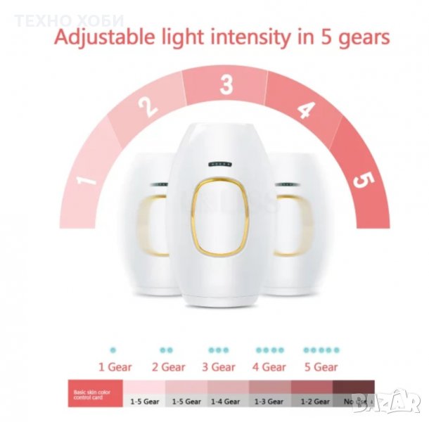 5 Регулируеми оптимално енергийни нива на работа според толеранса на кожата. Осигурява леко, безболезнено и лесно обезкосмяване, без да наранява кожата.