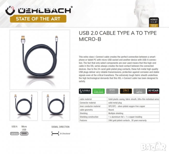OEHLBACH, OCC Copper, кабел/интерконект, USB A-MicroB, 1м. за Chord Mojo, Hugo, Arcam ... Като Нов