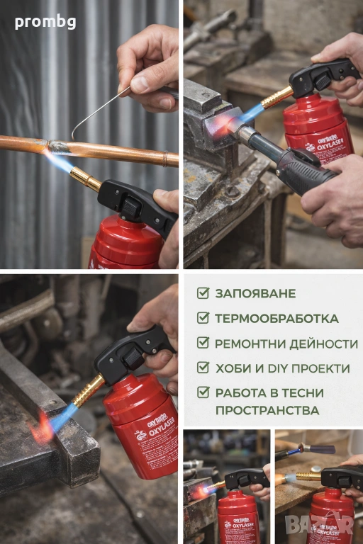 газова горелка OXYTURBO OXYLASER, произведена в Италия. Компактна, мощна и удобна за прецизни дейности, нагряване, запояване и работа в сервиз или домашна работилница. Подходяща за майстори, хоби проекти и професионална употреба.