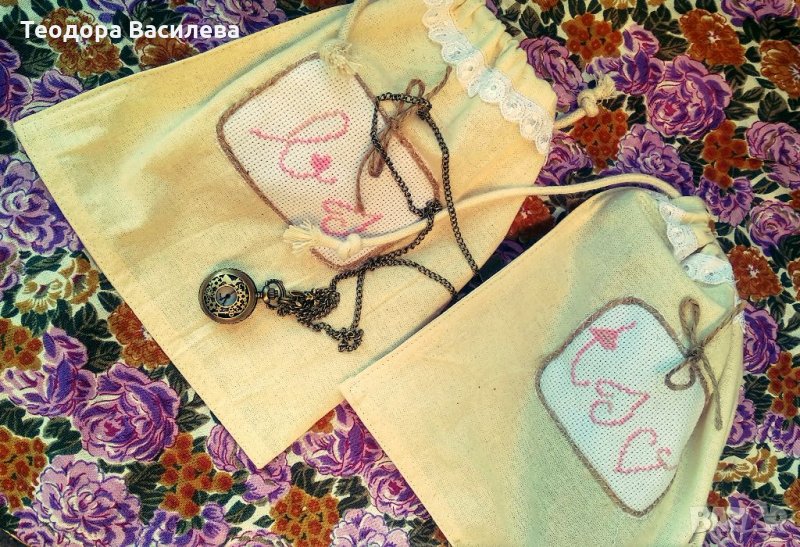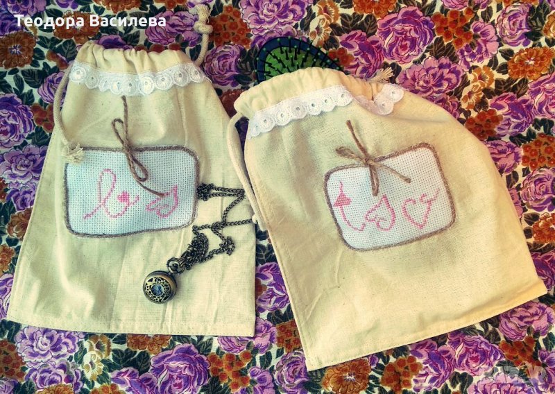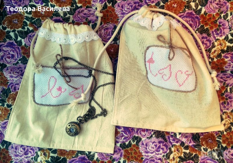Ретро торбичка с ръчна бродерия 100%памук. Инициали със сърца. Подходящи за съхранение на хляб, билки, чай, лични принадлежности или за подарък.