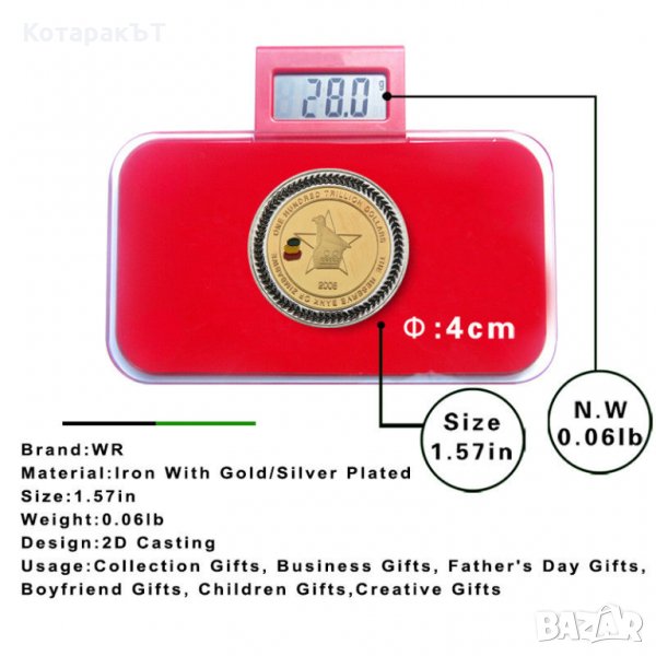 Диаметър - 40 мм, Дебелина - 3 мм, Тегло - 28 гр.