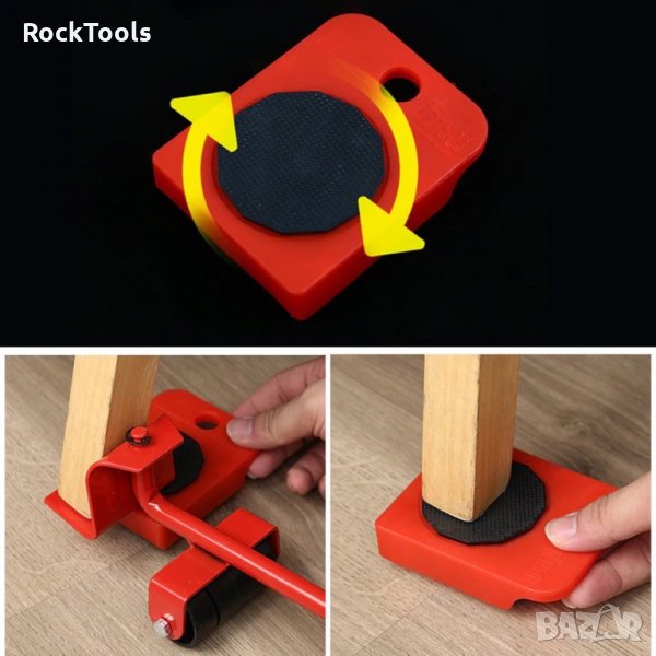 Начин на употреба: Поставете повдигащият лост под мебелите, за да ги повдигнете( повдигайте мебелите до 5 сантиметра, за да избегнете накланяне на мебелите) и добавете четирите подложки с колелата в ъглите. След това лесно плъзнете мебелите до желаното място. Рамото (повдигащият лост) има подвижна Z-образна планка за повдигане, която се върти около оста си на 180 градуса и позволява повдигането на мебелите от всяко положение. Подложките са снабдени с диск с грапава повърхност, която не им позволява да се изплъзнат и изместят по време на преместването. Дискът се върти около оста си. Това позволява подложките да бъдат правилно позиционирани под товара и при придвижването лесно да се насочва в желаната посока.