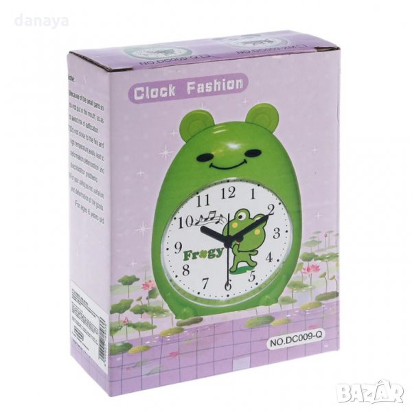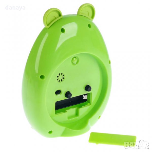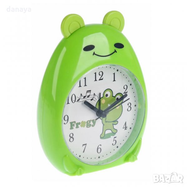 Будилник зелена жабка. Симпатичен детски настолен часовник с аларма с форма на весела жабка. Будилникът е подходящ за офис бюро, за детска стая или всекидневна. Аналогов дисплей, пластмасов корпус. Циферблата има големи цифри. Предлага се в кутия и е подходящ за подарък. Работи с една АА батерия (не е включена в комплекта).