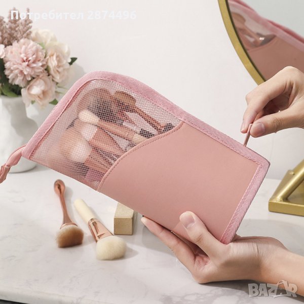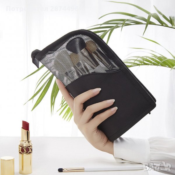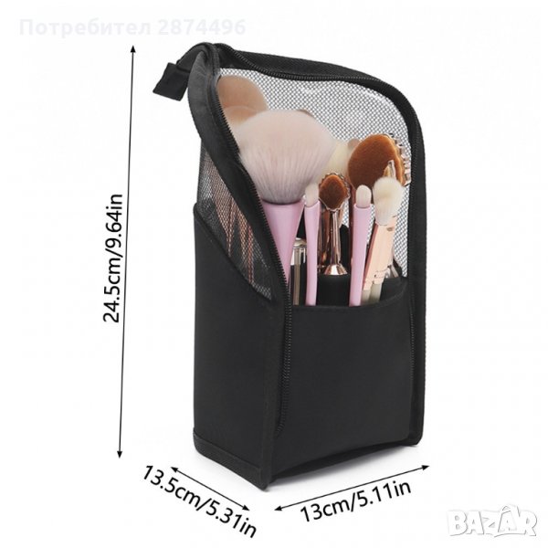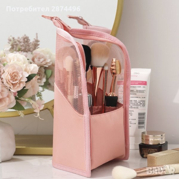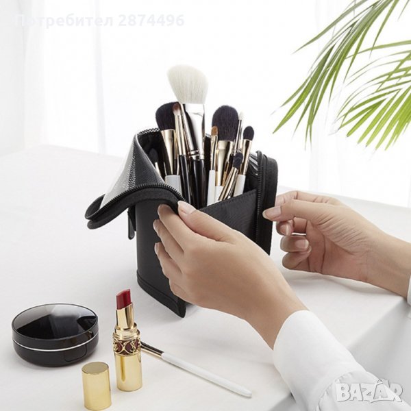 Изключително подходящ за козметика, принадлежности, лекарства или аксесоари. С малки вътрешни джобчета. Затваря се чрез цип. Превръща се във внастолна поставка за четки и моливи за грим.