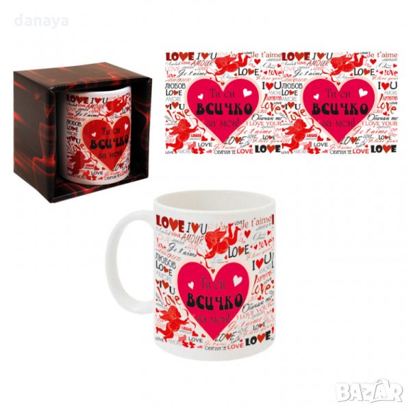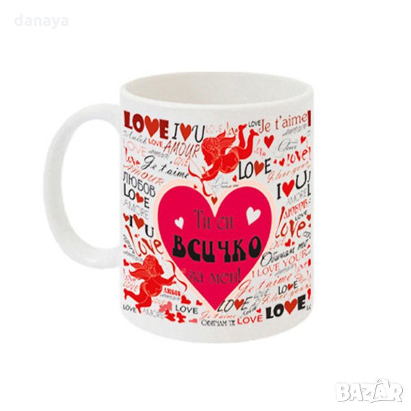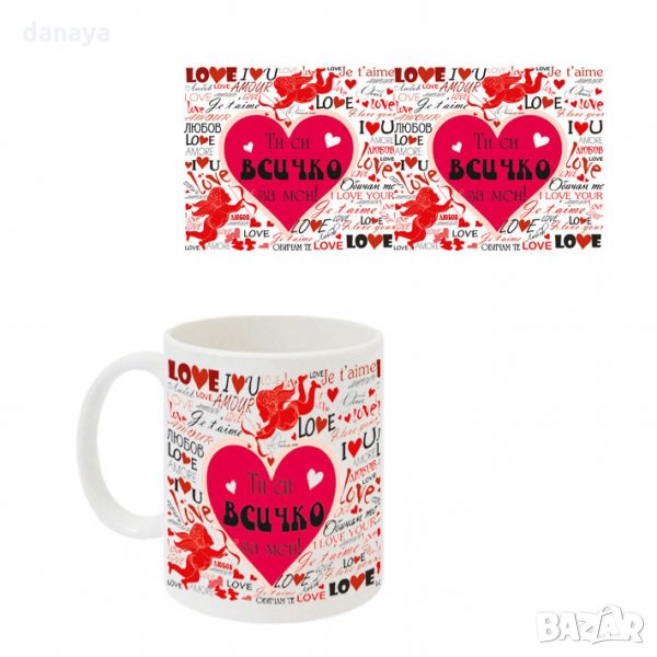 Романтичен подарък за Свети Валентин – керамична чаша с голямо сърце, а в него е изписан най-романтичното послание за една жена “Ти си всичко за мен!” Оригинален подарък за празника на влюбените. Чашата е един прекрасен и незабравим начин да напомните на любимия човек за истинските си чувства.