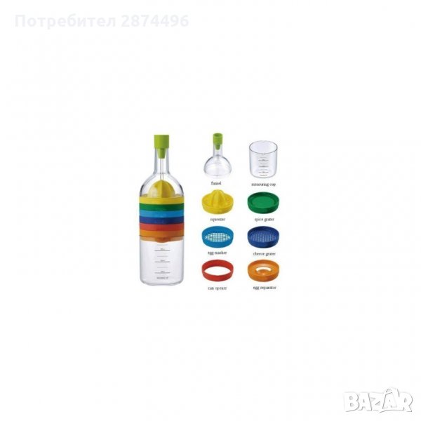 Практичен и цялостен комплект, който включва голямо разнообразие от кухненски прибори, като заема малко място, благодарение на подредената си структура в бутилка. Удобен и лесен начин за поддържане на ред в кухнята, за да имате под ръка всичко необходимо във всеки момент.