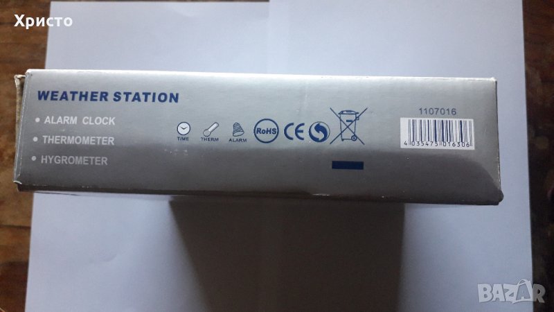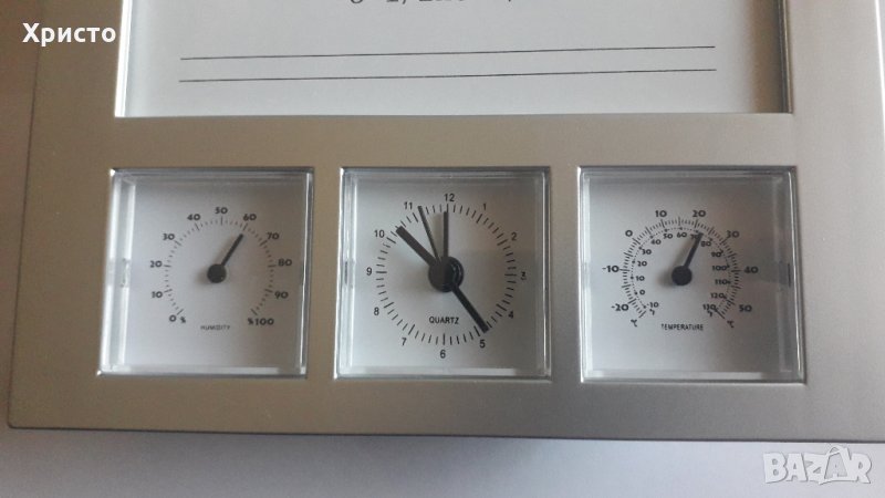 Продавам хидрометър с термометър, часовник и рамка за снимка антикварен, чисто нов, в кутия, донесен от Холандия Weather Station. Часовникът е кварцов и е с будилник. Работи с една батерия 1,5 волта АА, която не е включена в цената.. Размер на артикула 18х18х4 см. Материал алуминий е стъкло. За снимка с размер 15х10 см, отпред се вижда 14х9 см. Прекрасен подарък.