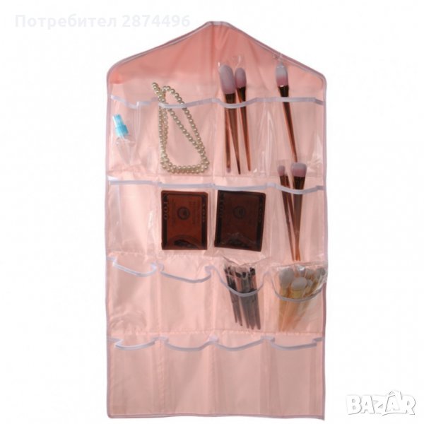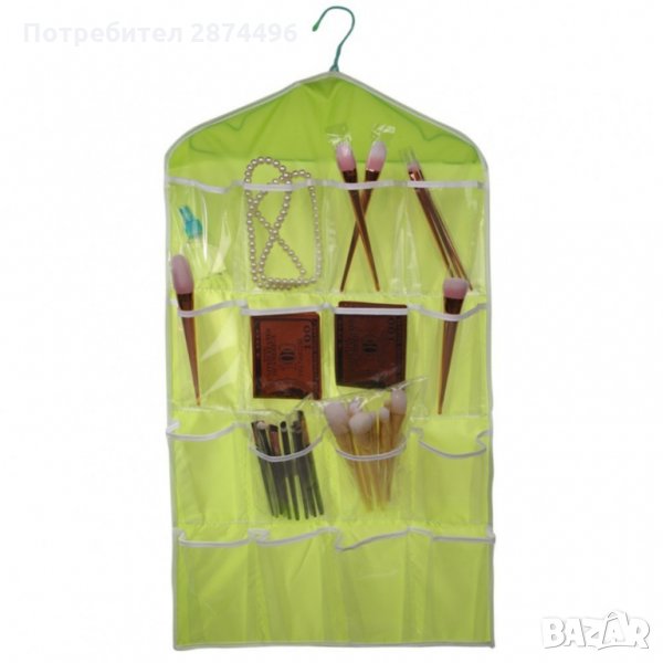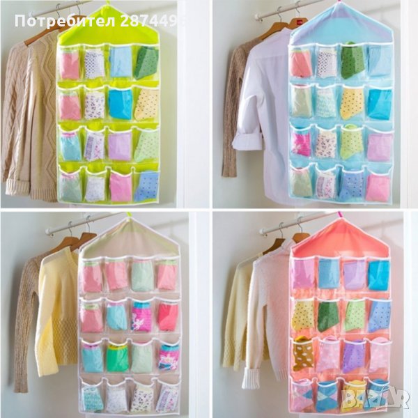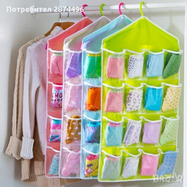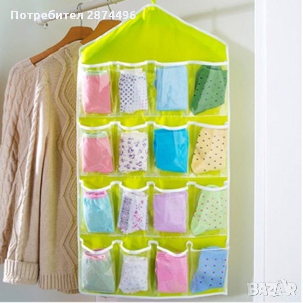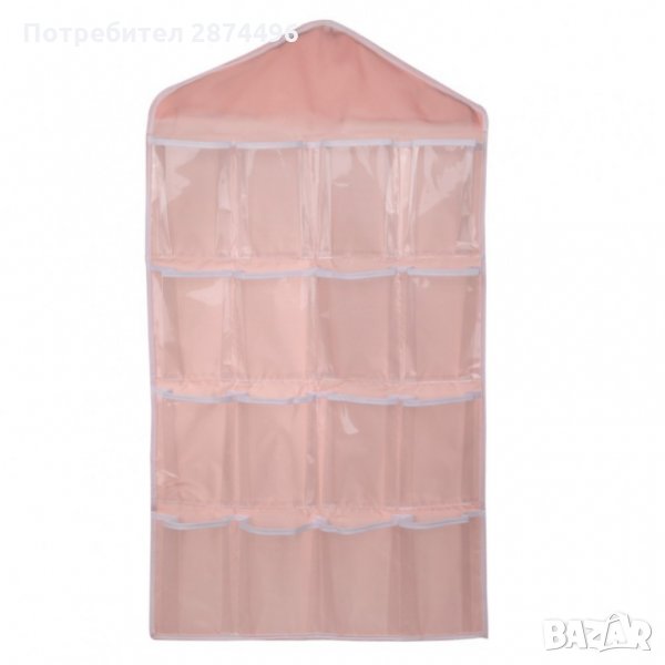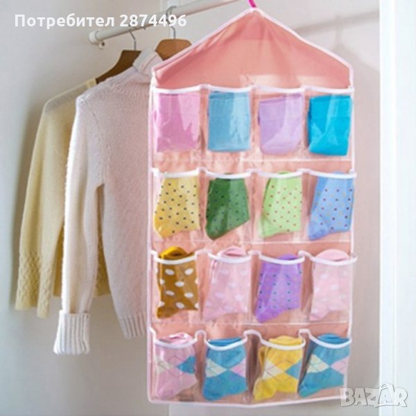 Практичен органайзер със 16 джобчета, подходящ за закачане в гардероб или на врата. Всеки джоб е прозрачен, така че всичко което търсите да бъде лесно открито. Освен за съхранение на чорапи и бельо, може да се използва и за съхранение на всякакви други дребни предмети като четки за грим, бижута, ножички, гребени и четка за коса и много други подобни.