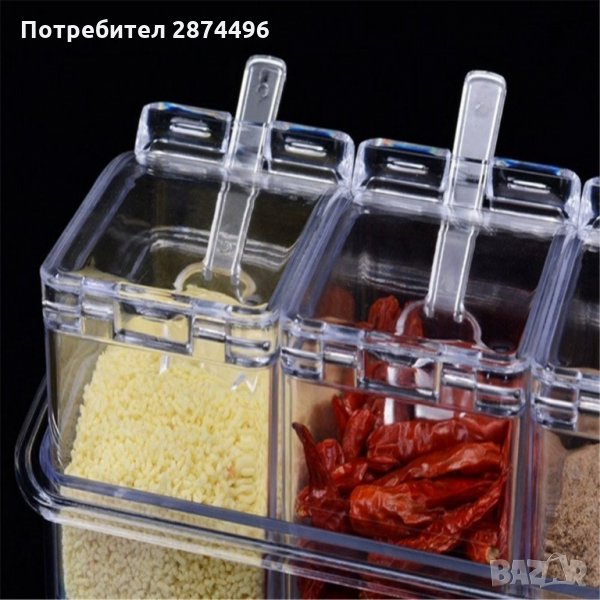 Кутията съдържа четири пластмасови контейнери, поставени в табла с крачета против плъзгане. Отделените контейнери са направени с капаче, за да не изветряват продуктите. Всеки от тях е снабден с малка лъжичка за да взимаш точното количество от подправките! Подходящи за съхранение на класически подправки, подправки за шкембе, различни видове чай, сухи билки и много др.
