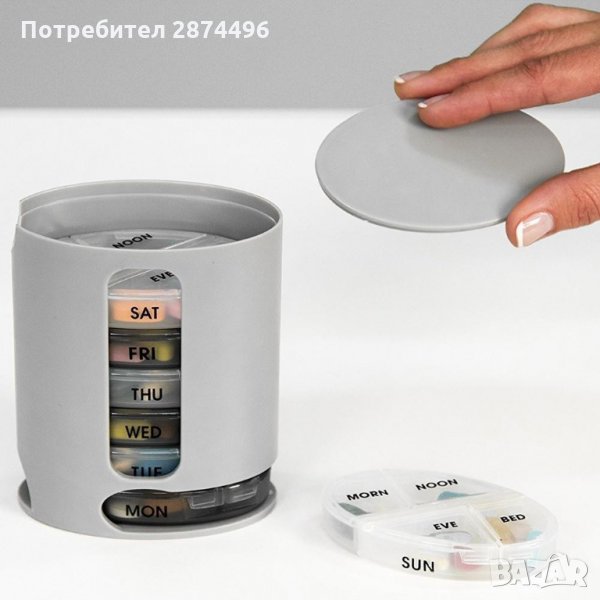 Той съдържа седем подвижни кутийки, по една за всеки ден. Всяка кутийка е обозначена за съиюответния ден и има отделения за различното време на деня - сутрин, вечер или преди лягане. Просто разпределете медикаментите за цялата седмица и всеки ден вземайте определената кутийка.