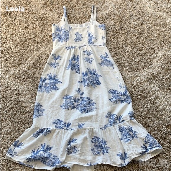 Бяла миди рокля Primark с дължина до прасеца от бял лен с френски Toile de Jouy син десен, с квадратно деколте, костенуркови копчета отпред, волани на подгъва и набори с ластици на гърба.
