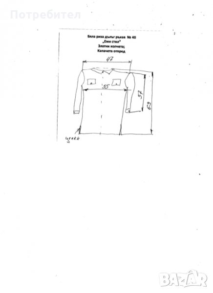 Бяла копринена риза с дълъг ръкав. Изработена от фирма „Еми стил“. Златисти копчета, декоративни капачета отпред на мястото за джобове.Отстрани има цепки. Размерите са описани на схемата.