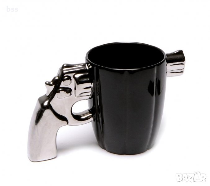 Код 89172 Забавна порцеланова чаша в черен цвят със сребриста дръжка във формата на пистолет. → Обява 35756548