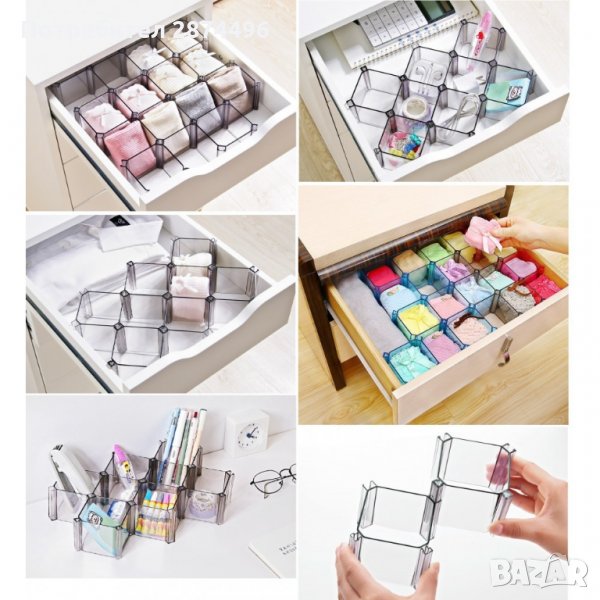 Органайзер за шкаф или чекмедже състоящ се от 6 квадратни отделения, съединяващи се едно за друго, по ваше желание. Органайзер за чорапи, бельо и др. дребни аксесоари, който ще внесе ред по гардеробите и шкафовете. Практичен и удобен