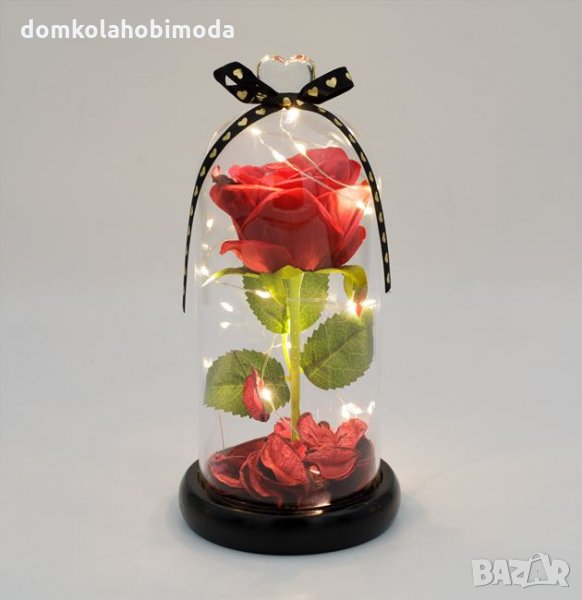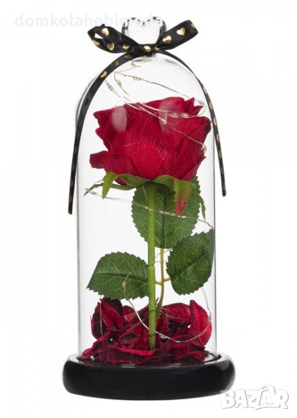 Изкуствена роза под стъклен похлупак, Дървена основа, Лед осветление, 11x24 см