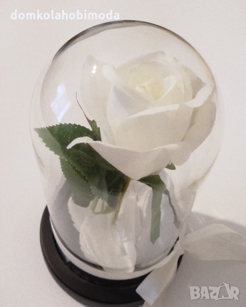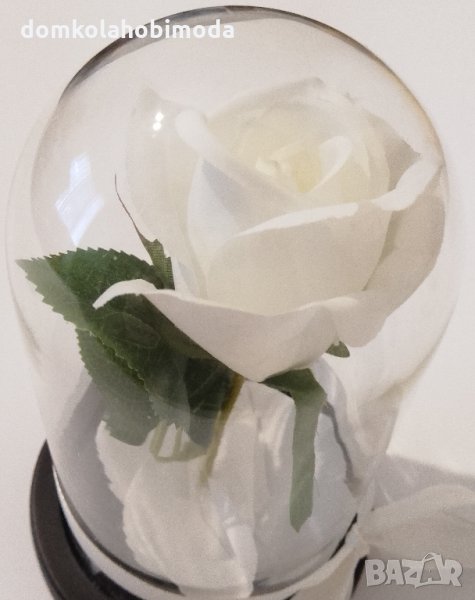 Изкуствена роза под стъклен похлупак, Дървена основа,Бяла