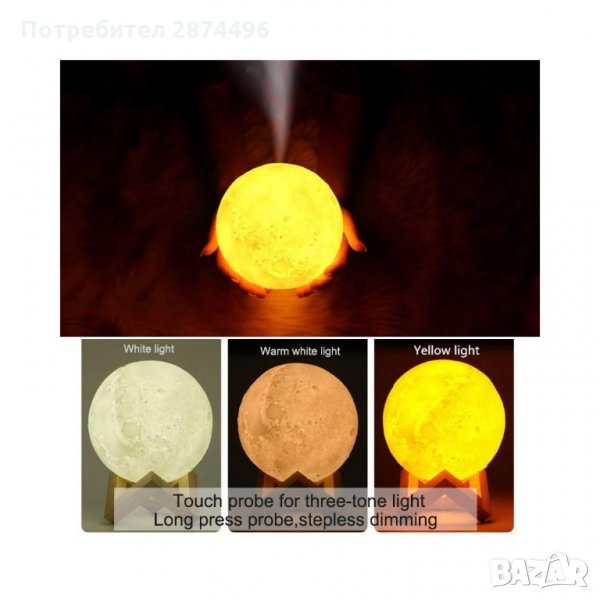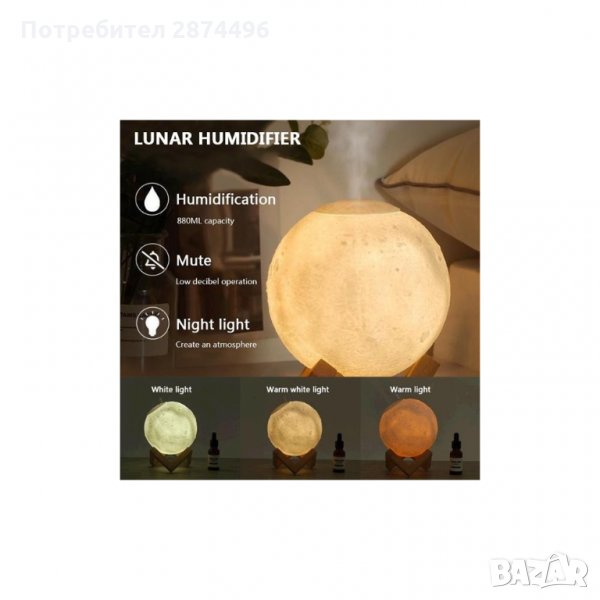 С реалистичната си 3D форма копира истинския релеф на Луната, и лампата преминава през всички нейни фази. Светлината и е мека и ненатрапчива. Осигурява приятна, успокояваща атмосфера. Дифузера работи напълно безшумно.